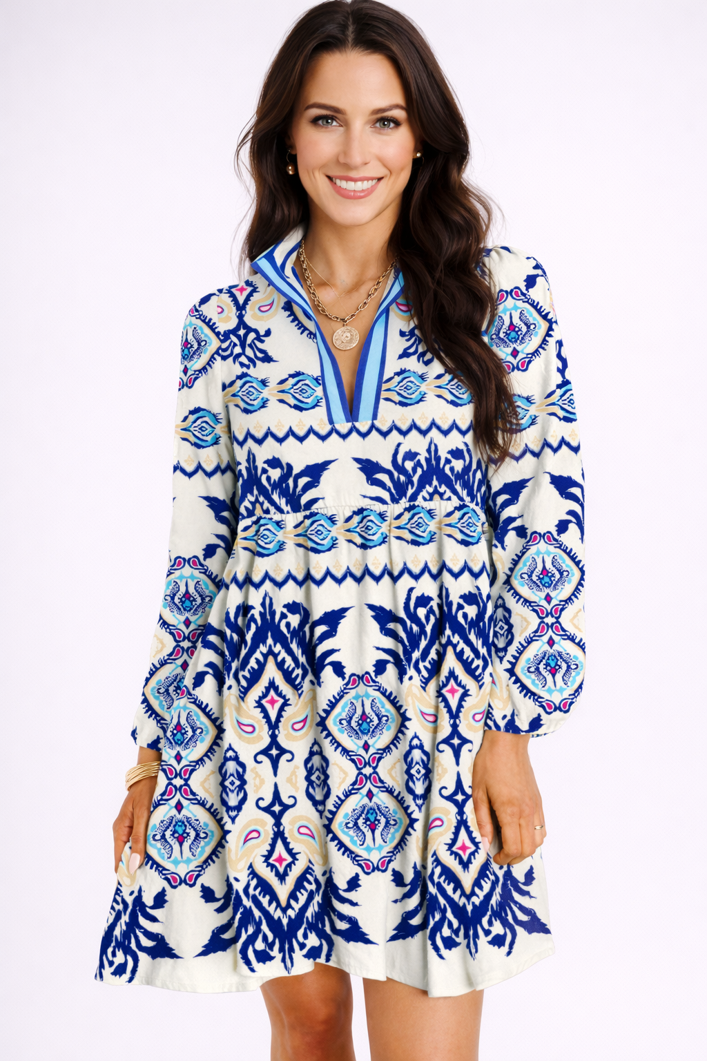 This long sleeve, flowy dress is sure to turn heads with ethnic print patter and striped split neckline, this one is so flattering!
