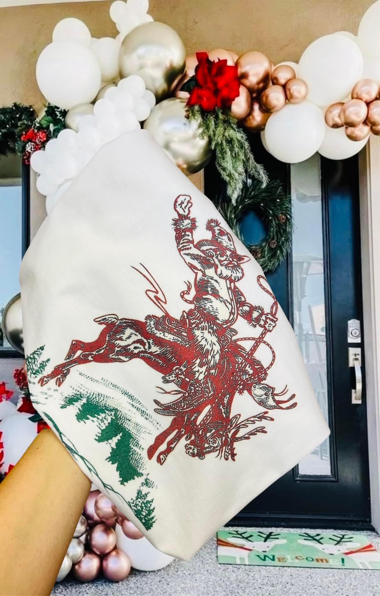 White Softstyle Tee with Santa riding a Bucking Reindeer graphic print