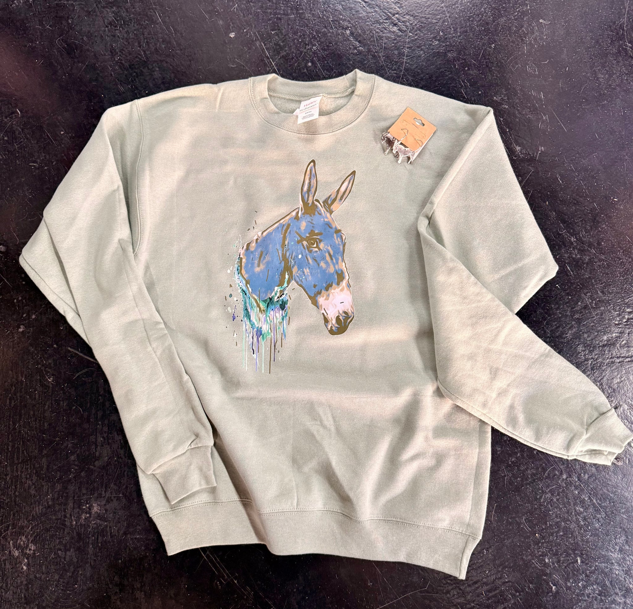 Sage Green CrewNeck Sweatshirt with Watercolor Mule Head graphic print!