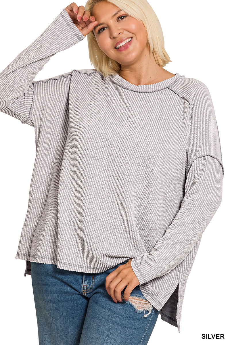 Raised-Rib, Raw Edge, Boat Neck, Long Sleeve Top